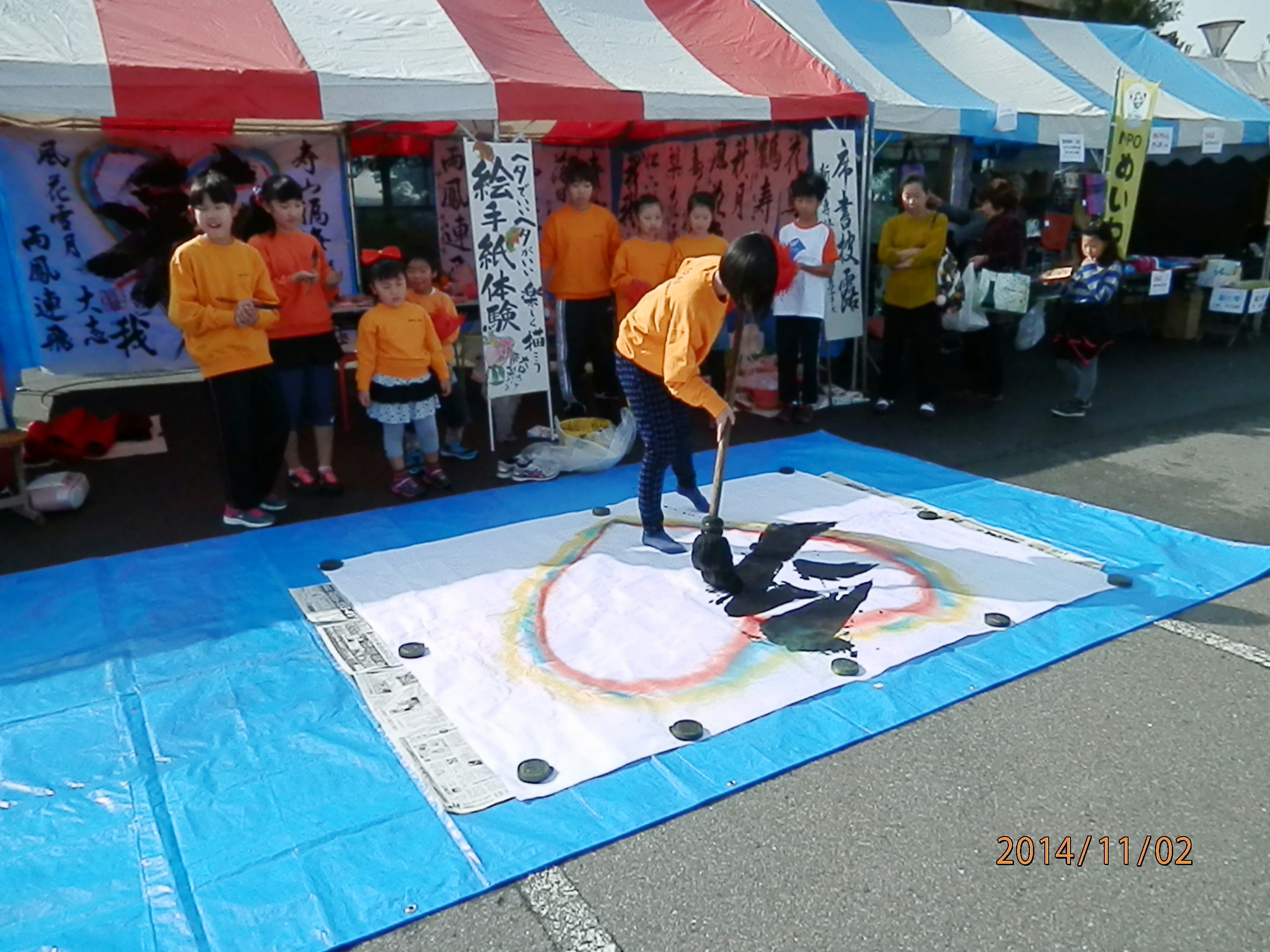11月2日明和町産業祭にて、行書コース生が席書き披露を 行いました、大勢の来場者に「すごく上手!!」と感嘆の声を かけていただき,書き上げた作品は差し上げました。 障子紙4枚分の紙に大筆で「彩」と書き上げ拍手をたくさんいただきました。
